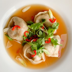 - Ladle broth into the bowl over the wontons and top with the spring onion, chilli and coriander.